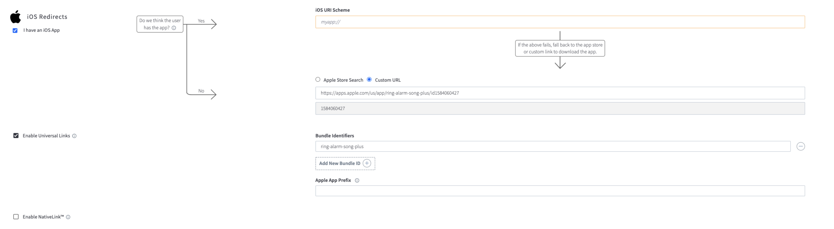 It needs to set the iOS URI Scheme , Custom URL and Bundle Identifiers.
